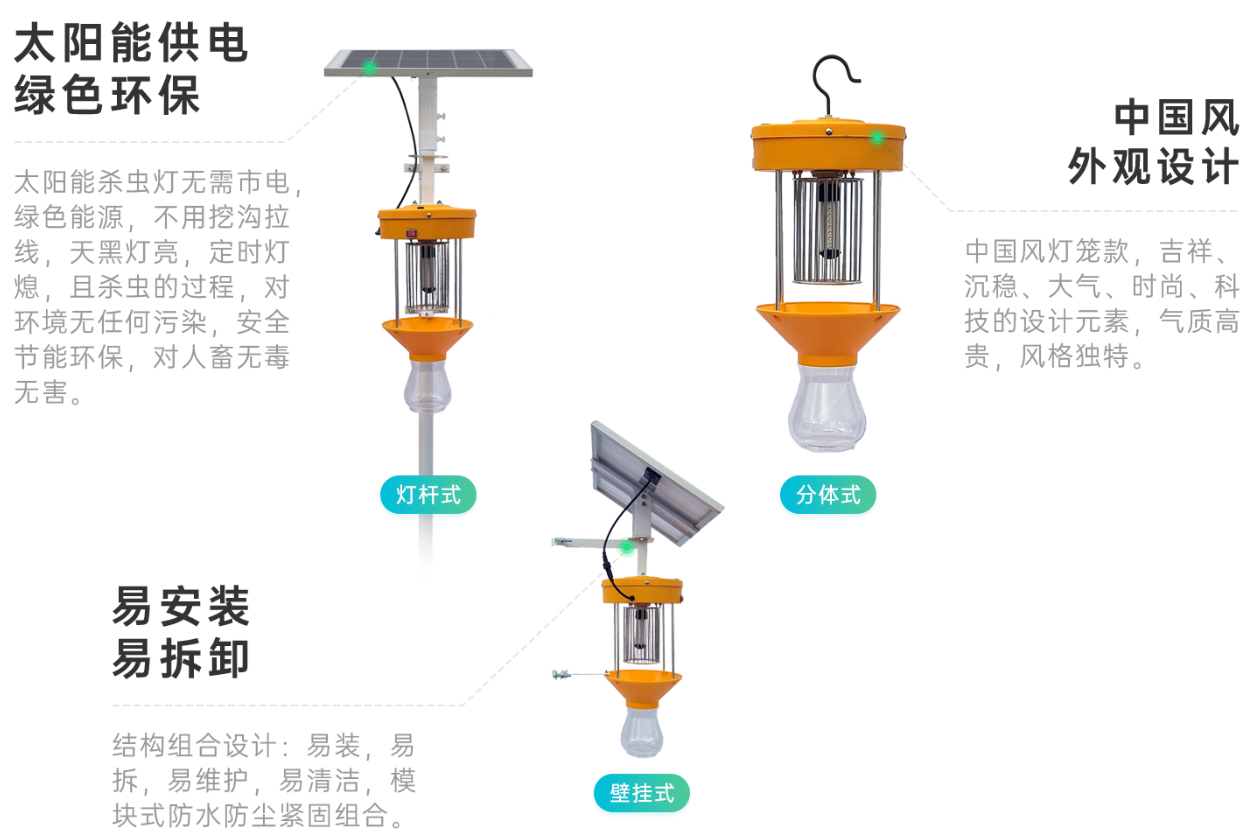 具備光控、雨控、時(shí)控 3種智能控制切換模式,實(shí)現(xiàn)依據(jù)晝夜、 天氣、時(shí)段變化自動(dòng)控制燈光,無需人工看管也能智能殺蟲。